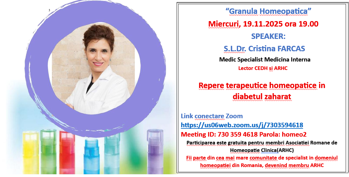19 noiembrie @ 19:00 – 20:30 GH – Repere terapeutice homeopatice in diabetul zaharat – Dr. Cristina FARCAS Webinar